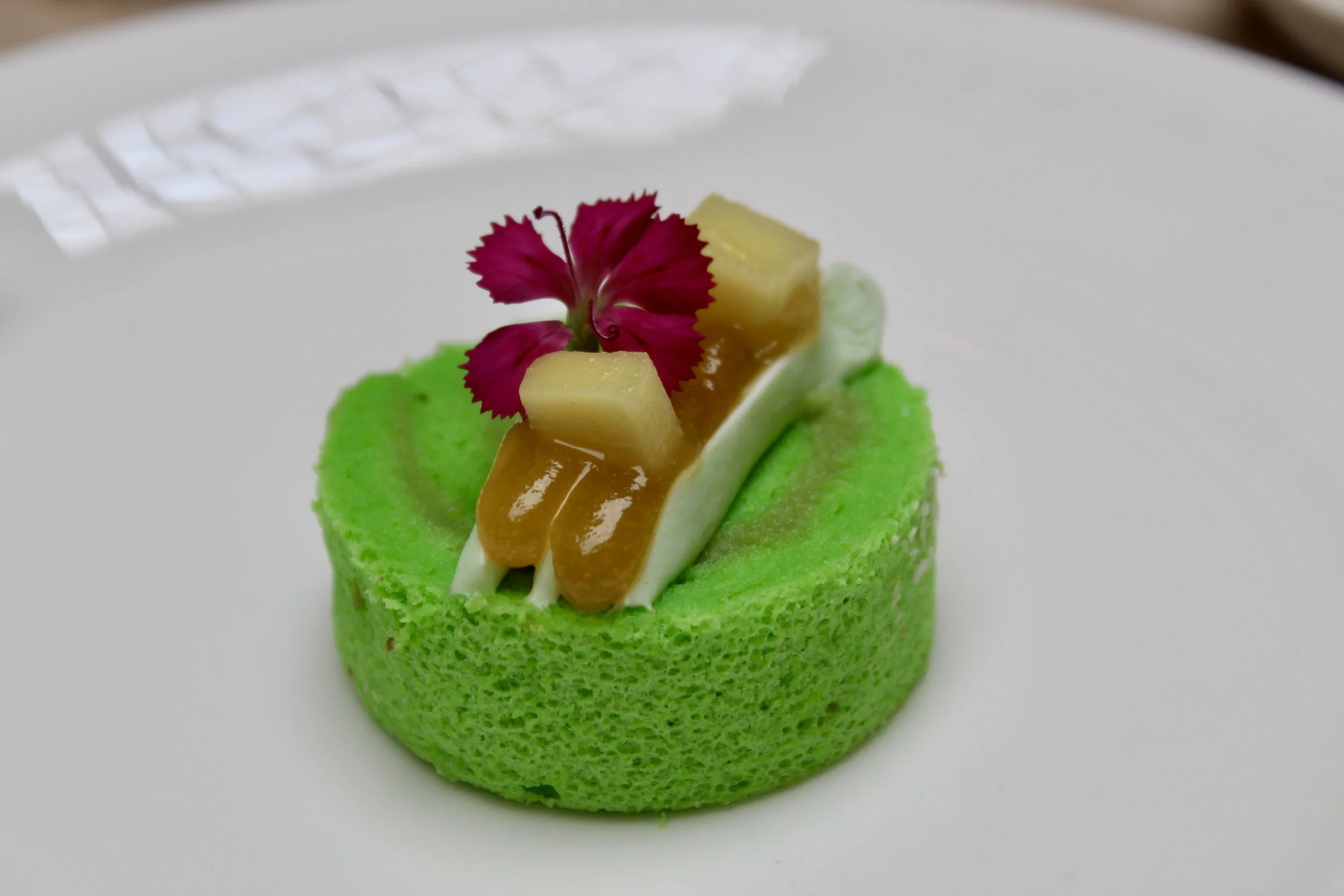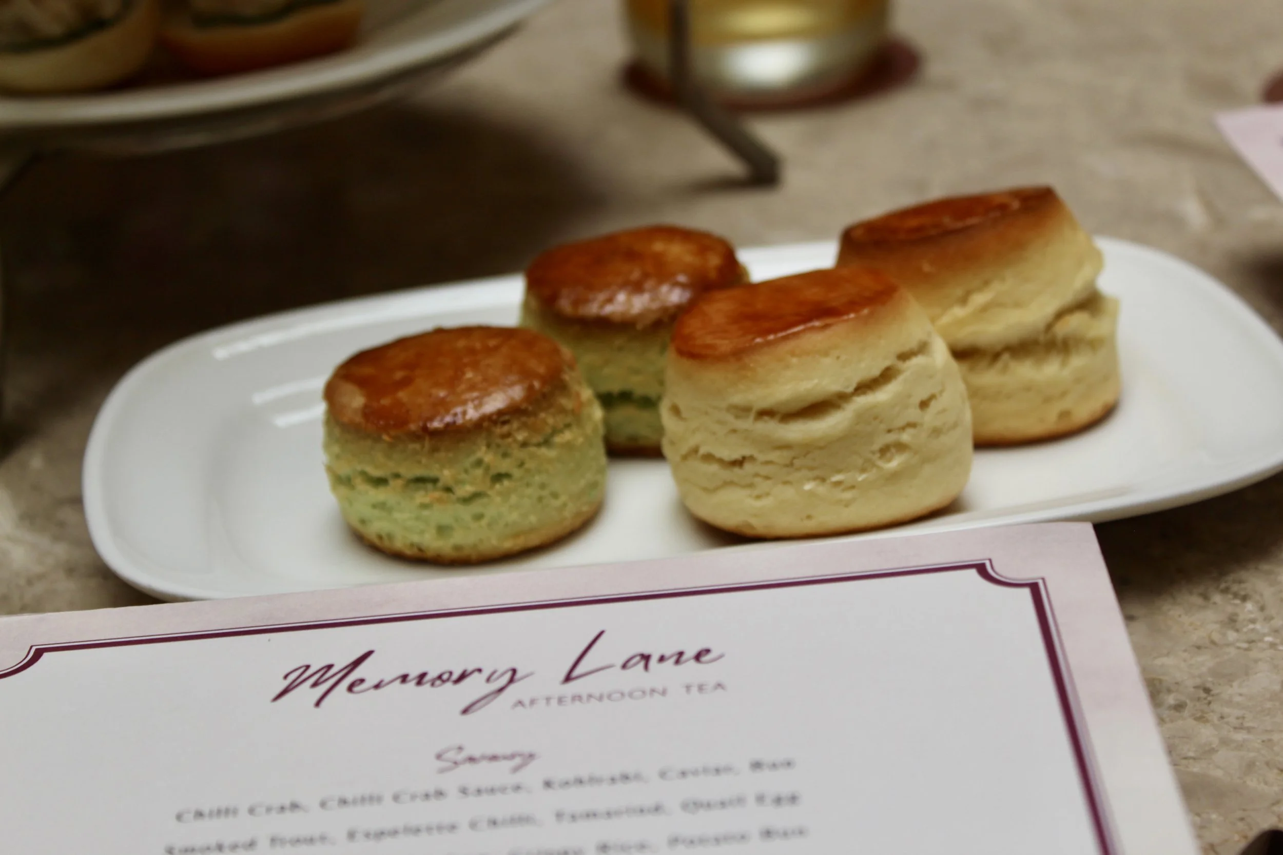In the three tier serving stand there were two plates of savoury bites and one for sweets, with scones also being served on the side. In true Singaporean fashion, the scones were not only served with clotted cream, but also with kaya, a coconut jam typical of this area and famously served in kaya toast. All of the bites were delicious, but I’d like to make special mention of the pandan roll cake layered with kaya, which was moist and perfectly sweet.