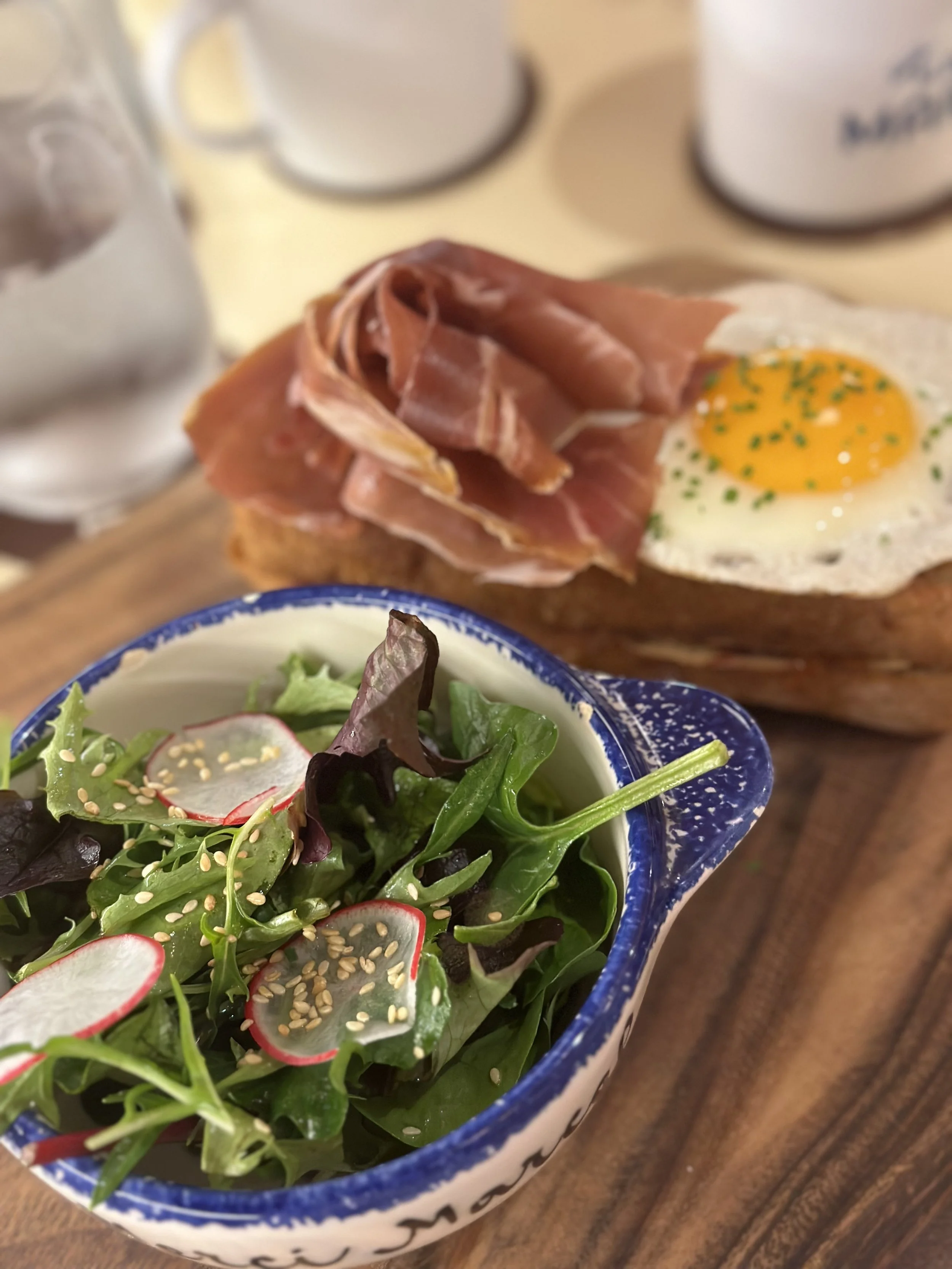 Moving on to the food, we ordered the croque Marcel and scrambled eggs (with truffle) to share and both were very good, along with some iced lattes which came in the cutest mugs. I enjoyed the way the croque Marcel was presented, with great quality prosciutto and sourdough bread. It also came with a side salad which was clearly very fresh; the leafy greens being brightly coloured.